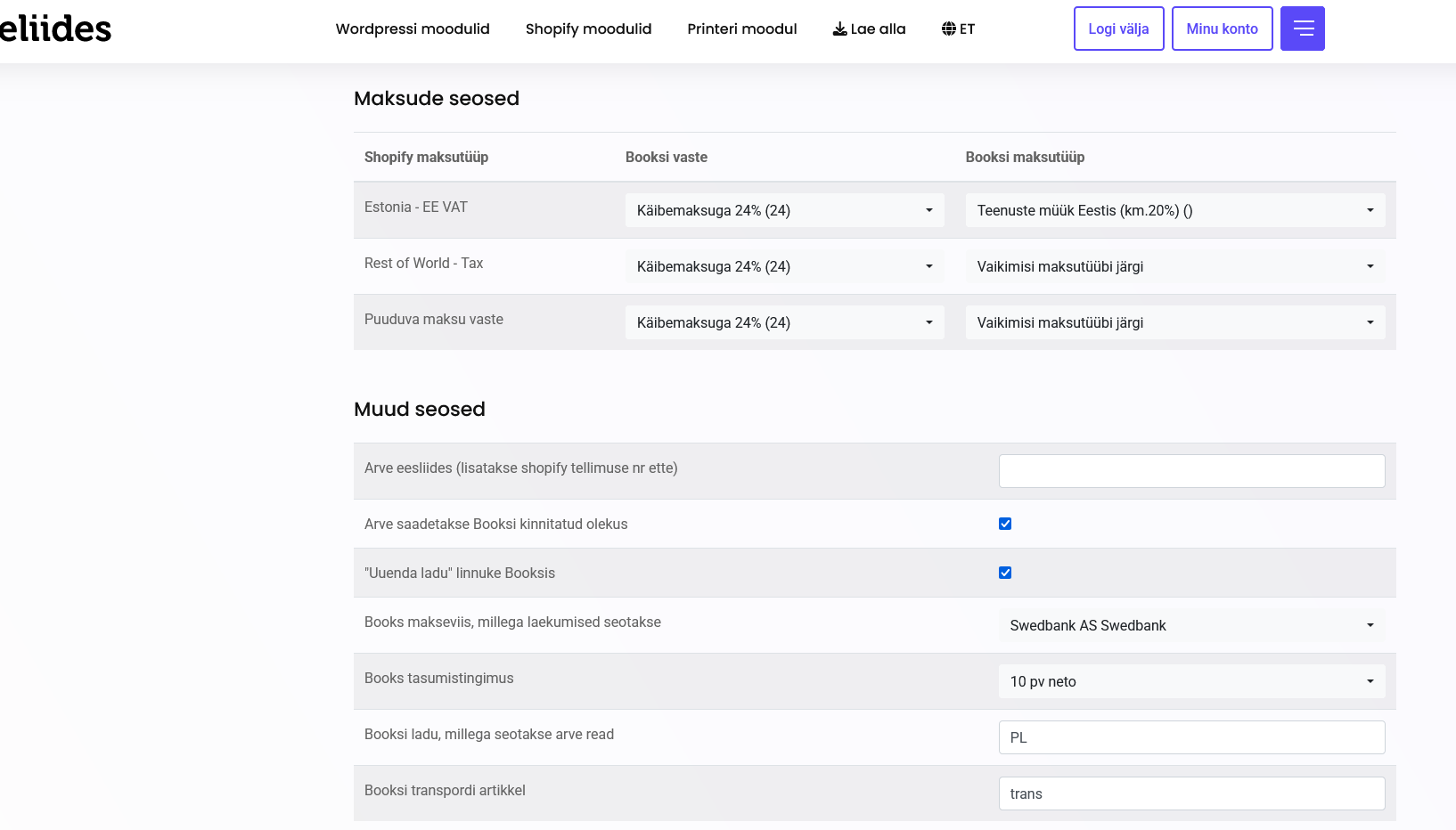 Kui e-poes on riikide põhiselt maksud seadistatud, siis tuleb ära seadistada e-liidese seadetes maksude vasted Booksiga.