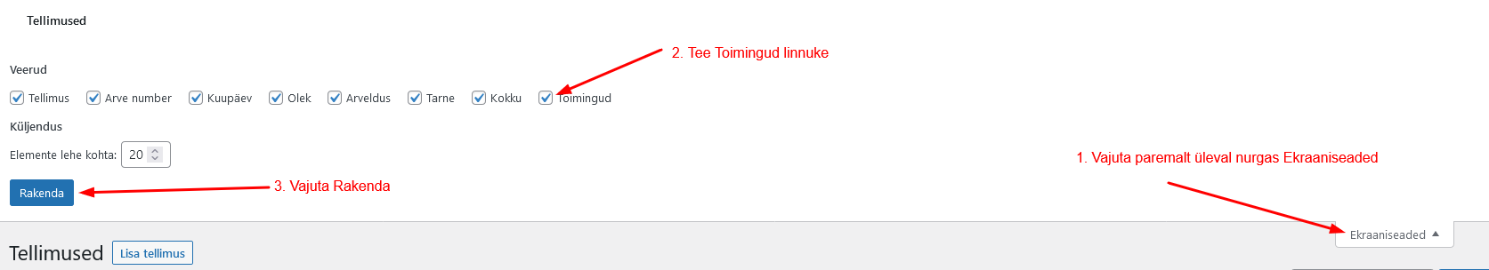 - Kui tellimuste nimekirjas puudub "Toimingud" tulp, siis tuleb vajutada ekraani paremal üleval nurgas Ekraaniseaded ja teha linnuke Toimingud ette ja salvestada
