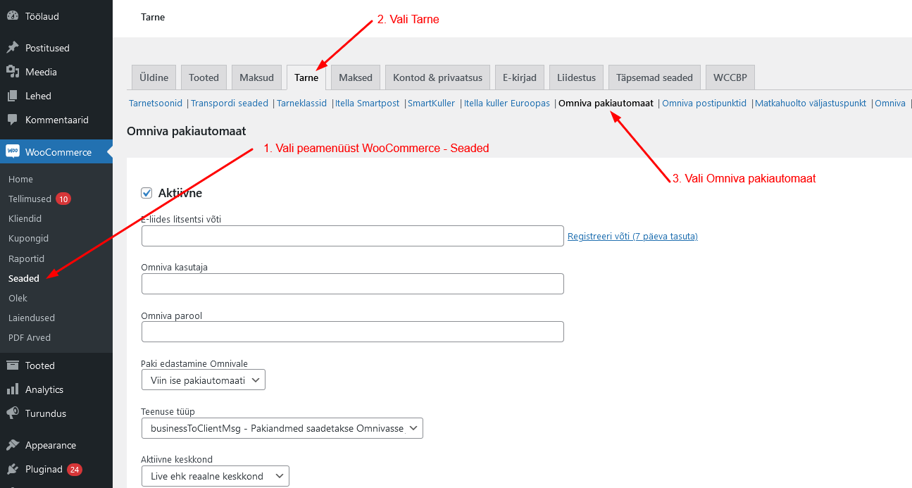 Woocommerce - Seaded - Tarne - Omniva pakiautomaat - Sisesta punktis 1 saadud litsentsi võti lahtrisse E-liides litsentsi võti