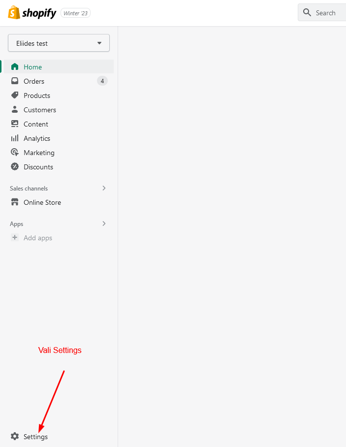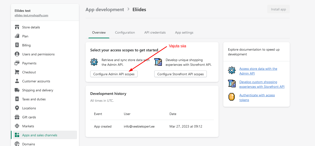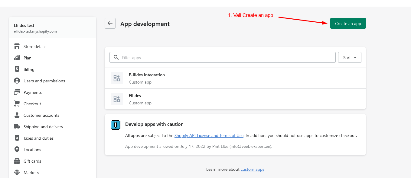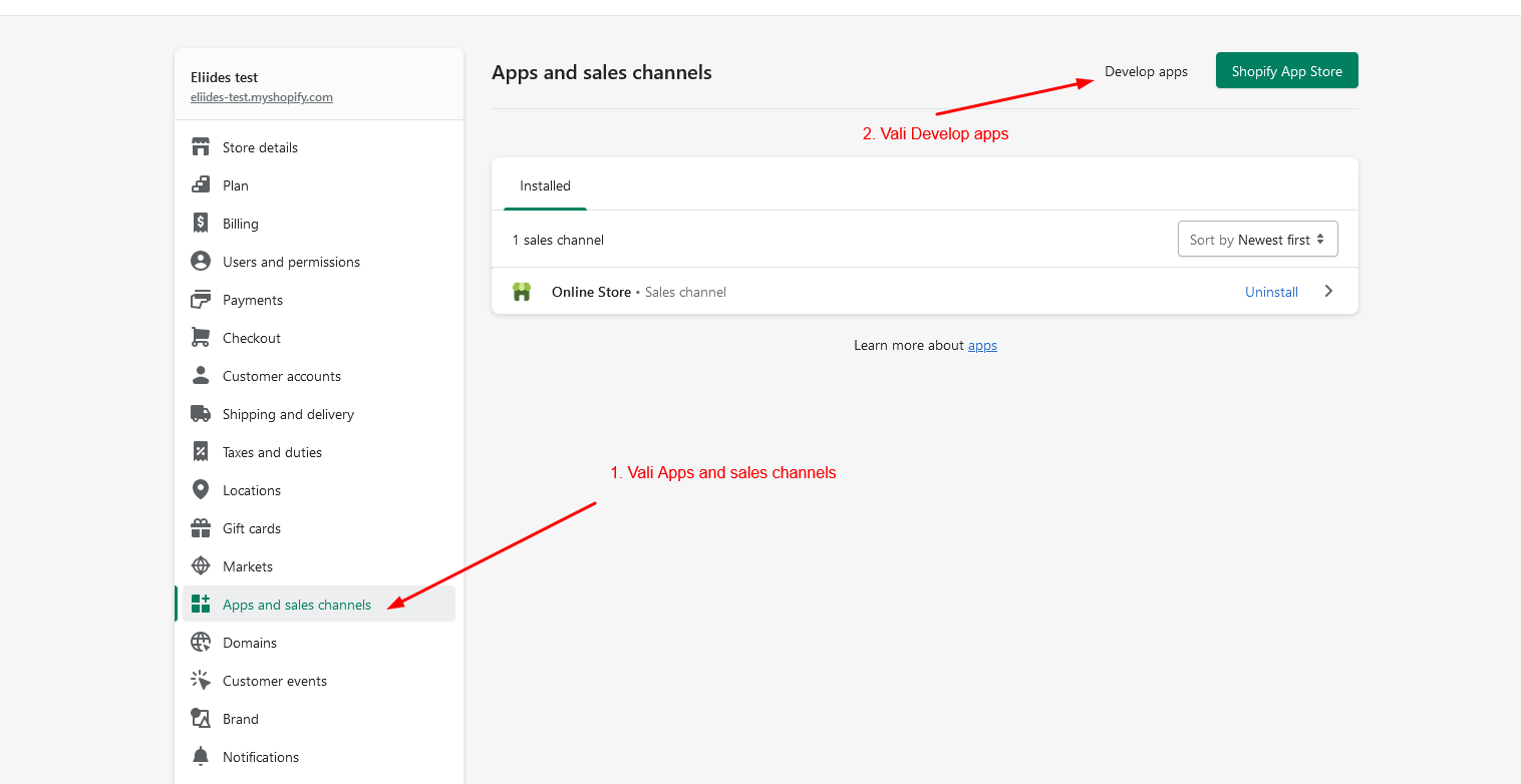 - 3. Vali "Apps and sales channels" ja seejärel "Develop apps", vaata pilti