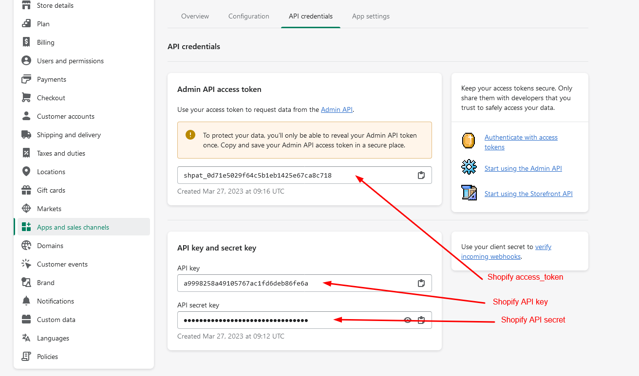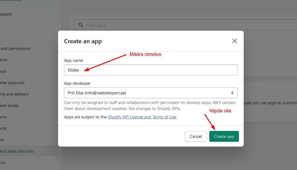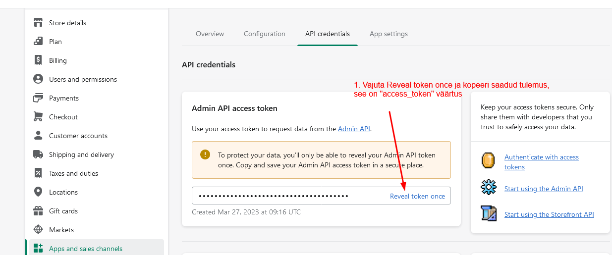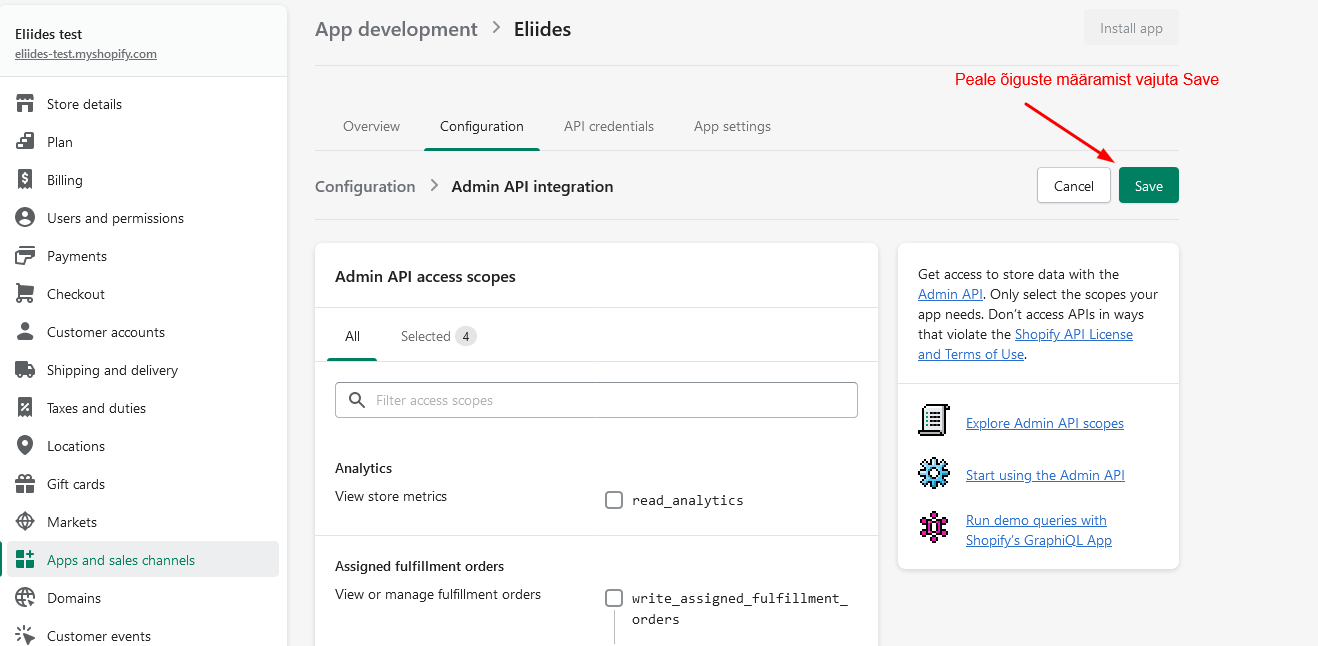 - 2. Määra käesoleva juhendi punktis 2 saadud Shopify liidese andmed.