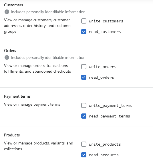 - 7. Määra "read_customers", "read_orders", "read_payment_terms" ja "read_products" õigused, vaata pilti