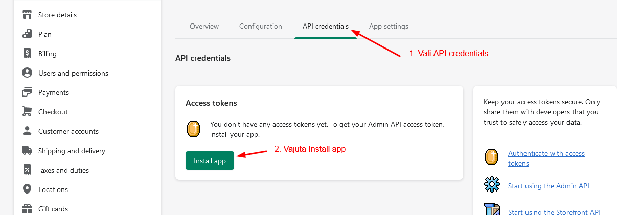 - 9. Vali "API credentials" ja seejärel "Install app", vaata pilti