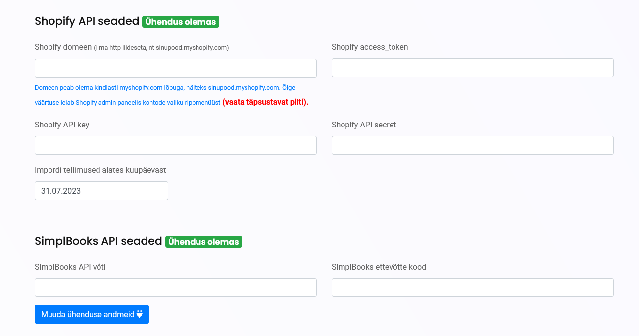 - 5. Määra SimplBooksi API võti ja ettevõtte kood, mille leiab SimplBooksi programmist.