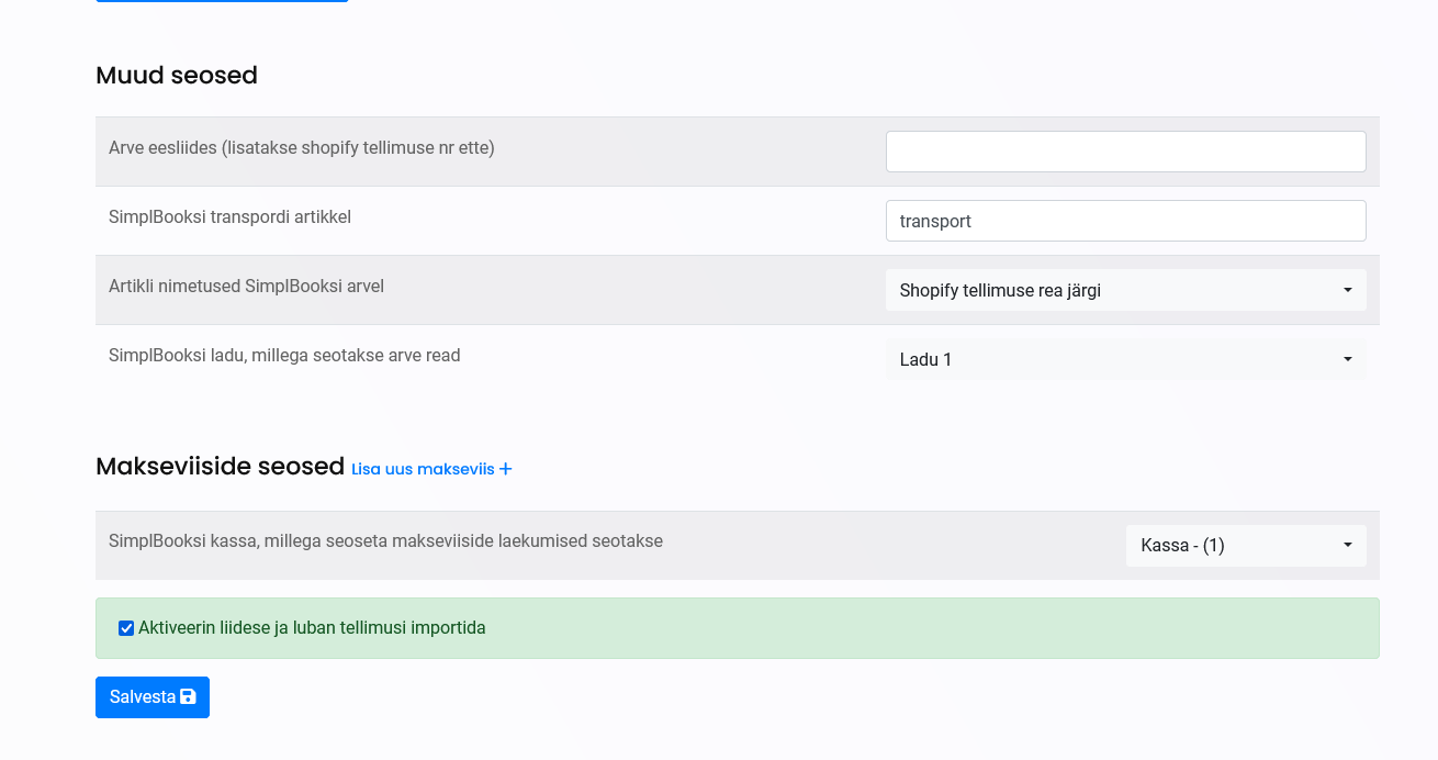 - 2. Kuna Shopify API ei suuda väljastada makseviise, siis tuleb määrata kõikidele Shopify tellimustele ühine kassa, millega laekumine seotakse.