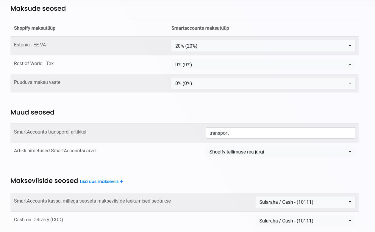 - 1. Kui SmartAccounts ja Shopify ühendus on loodud, siis tuleb määrata vajalikud seosed.