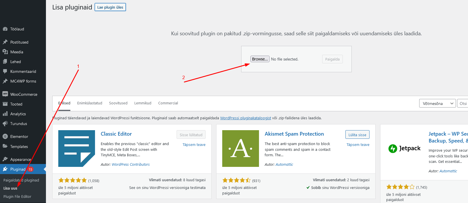 - Järgmisena otsi ülesse nupp "Lae plugin üles" või "Upload Plugin" ja vajuta sellele.