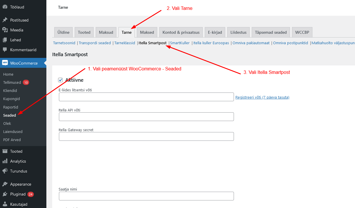 Woocommerce - Seaded - Tarne - Itella Smartpost - Sisesta punktis 1 saadud litsentsi võti lahtrisse E-liides litsentsi võti