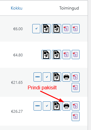 - Nüüd saab tellimuse real toimingud tulbast pakisildi PDF alla laadida printeri ikoonile klikkides