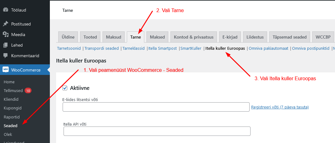 Woocommerce - Seaded - Tarne - Itella kuller Euroopas - Sisesta punktis 1 saadud litsentsi võti lahtrisse E-liides litsentsi võti